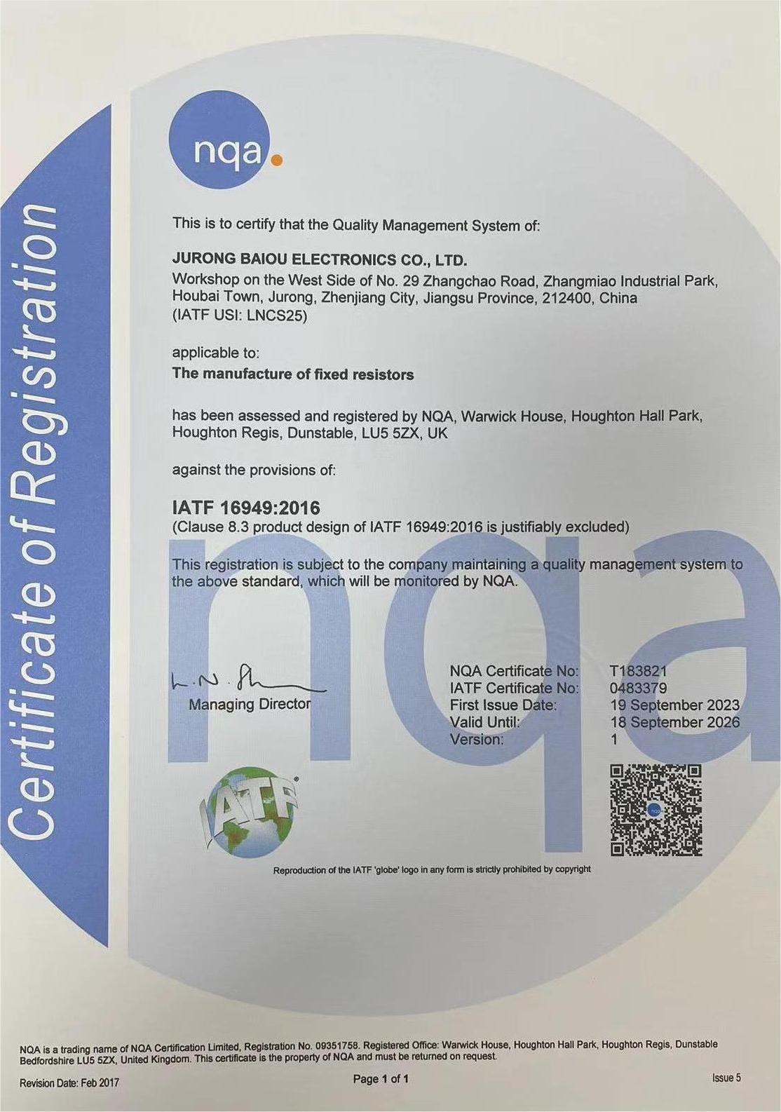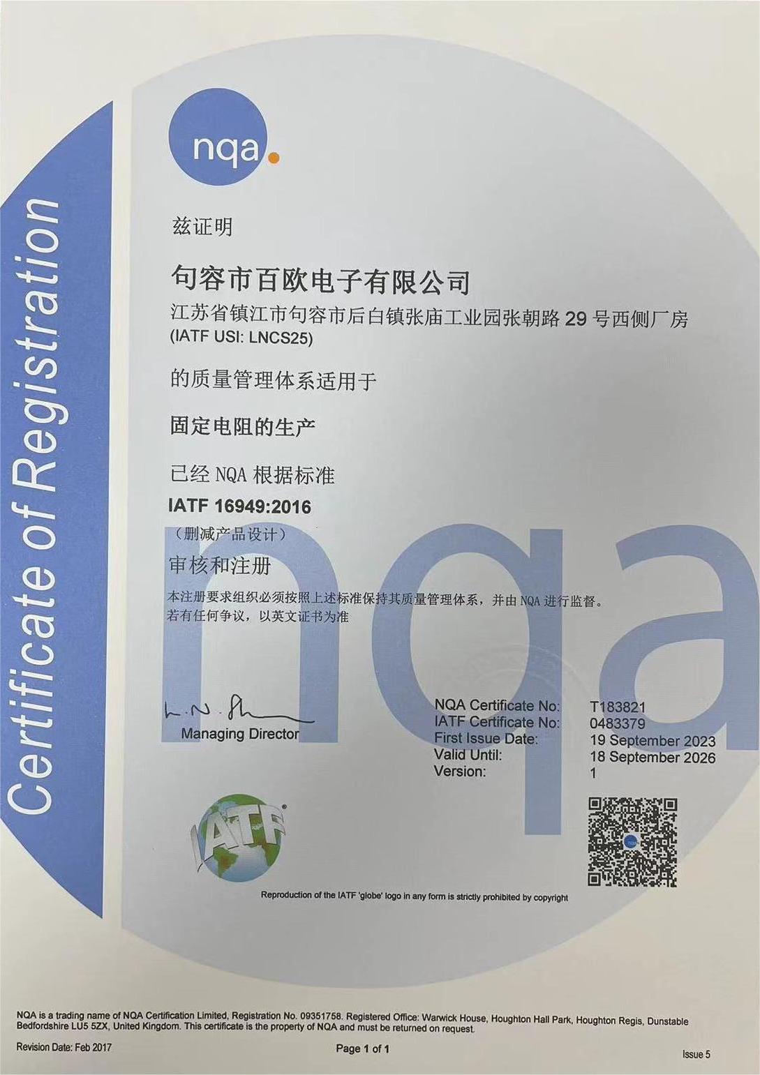 质量是企业的生命线,是企业的命脉和灵魂。为进一步规范公司的业务流程、有效控制风险、把握生产质量,提高客户满意度,形成公司规范化及标准化的经营模式,句容市百欧电子有限公司于2022年2月份推行IATF16949质量管理体系认证的相关工作,并在2023年9月份首次通过IATF16949质量管理体系认证。